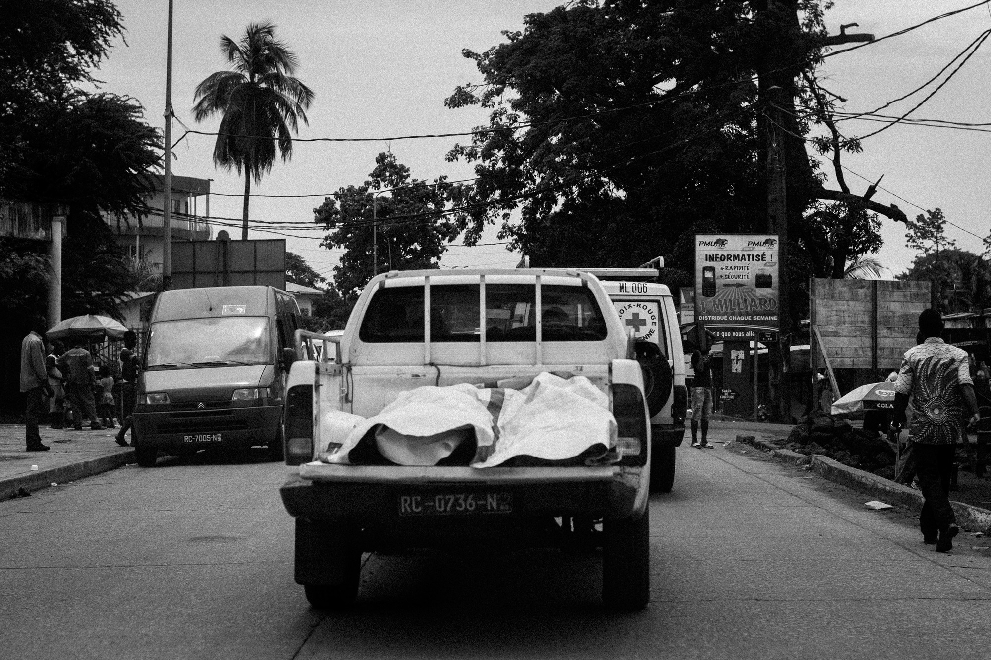 Y de nuevo a cruzar Conacry. La casa del imán estaba llena de vecinos. Una mujer de la familia me dijo que no podía hacer fotos dentro de la vivienda pero sí en el cementerio, que es un lugar público. Así que guardé la cámara en la mochila. Ya con el muerto cargado de nuevo en el coche, se me ocurrió fotografiarlo desde atrás en la puerta del camposanto. En pocos segundos cayeron sobre mí los puños de varios hermanos del fallecido y me arrancaron la cámara de las manos. Si en ese momento no me lincharon, fue porque los chicos de la Cruz Roja se liaron también a mamporros para defenderme. La escena, con el muerto de ébola en el suelo y 30 personas a golpes, fue surrealista. Hubo que esperar hasta el final del entierro para explicarles que sí teníamos permiso y poder recuperar la cámara. Así era el Conacry donde se expandía el ébola, una ciudad que temía a la enfermedad y a la estigmatización por igual.