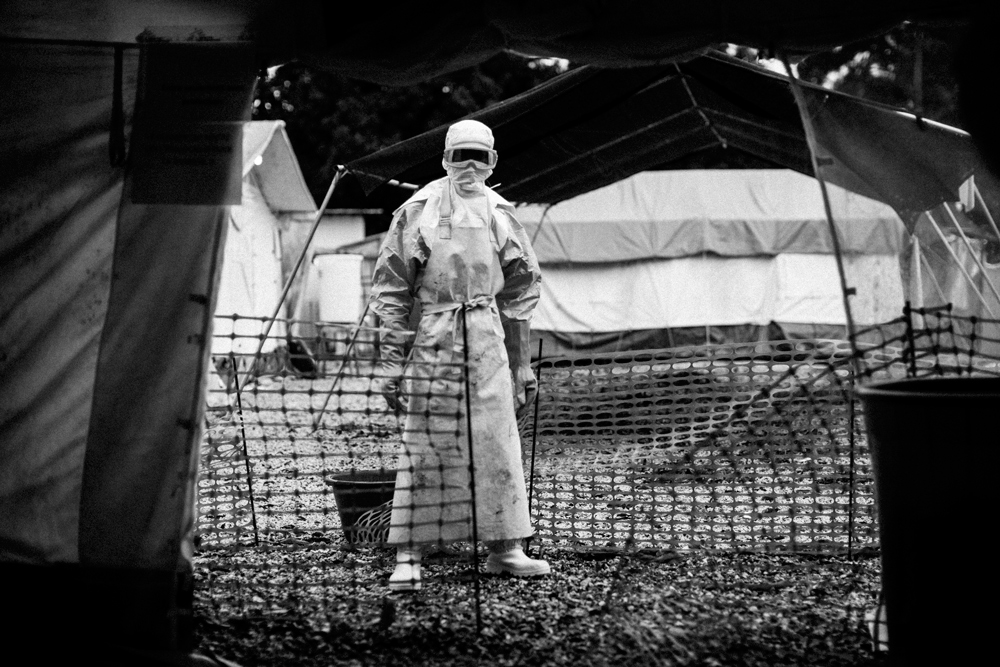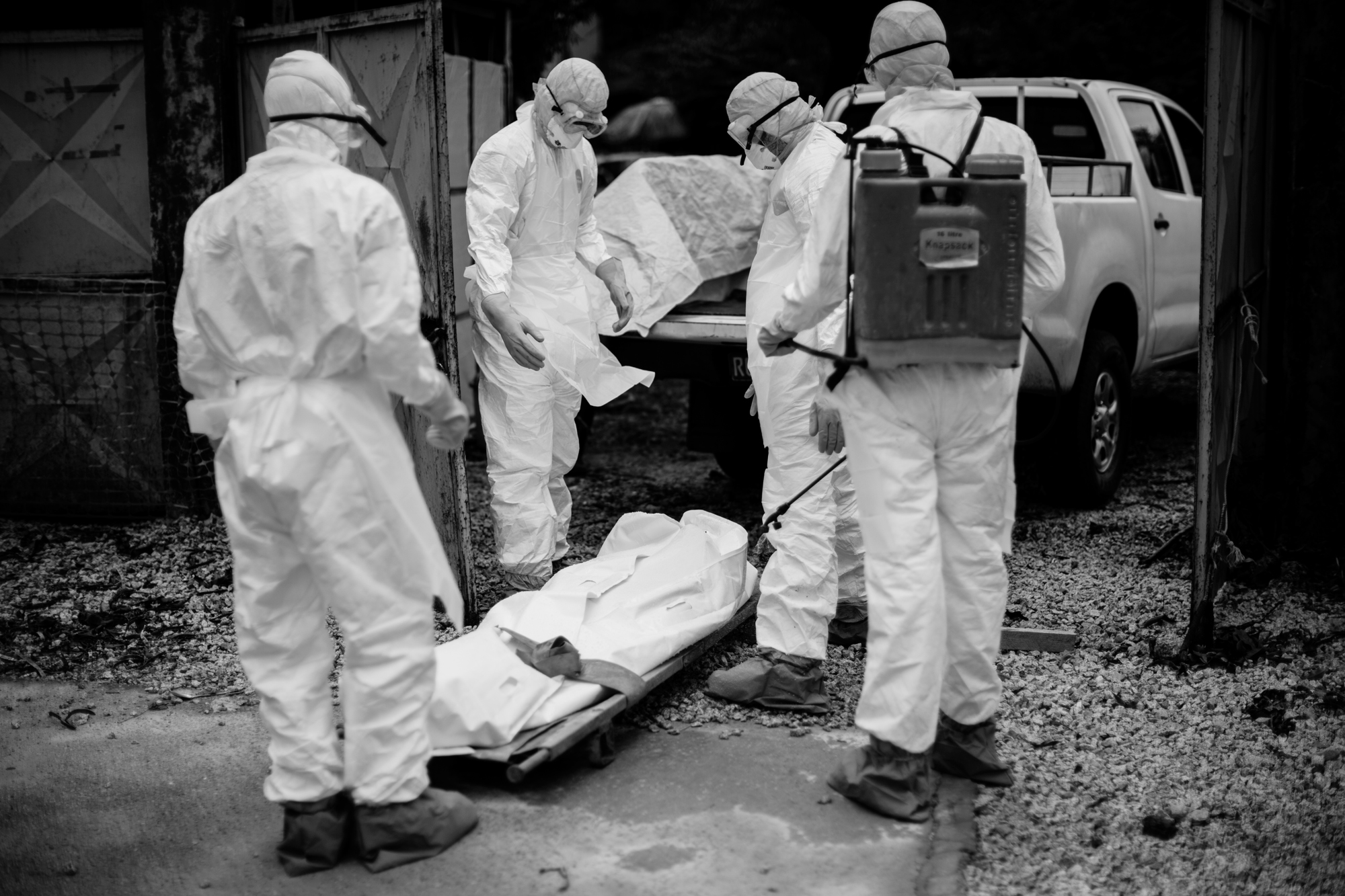Más que ver, uno intuía que Abu, que me había reconocido a pesar del traje, era el que saludaba dentro. A ambos lados de la puerta se abrían habitaciones individuales. Dentro había una cama, una radio, un teléfono móvil y un barreño para los vómitos. Ninguno de esos objetos saldría de allí. Toda la zona estaba contaminada de fluidos, sobre todo la morgue. Dentro encontramos dos cuerpos en bolsas blancas. Con un aspersor de agua con cloro se desinfectaba todo lo que era susceptible de pisarse o tocarse. Yo disparaba la cámara a ciegas, porque con las gafas empañadas era imposible enfocar. Clic, clic, clic. Los voluntarios de Cruz Roja subieron los cuerpos a una pick-up y nosotros comenzamos a quitarnos el traje de nuevo pieza a pieza, con lavado de manos a cada paso y el asesoramiento del resto del equipo. “Bueno, si dentro de 21 días te sigues encontrando bien es que esto lo has hecho correctamente”. Ese tipo de frases irónicas se decían a cada momento. Y gracias al humor se sobrellevaba mejor el drama que lo envolvía todo.