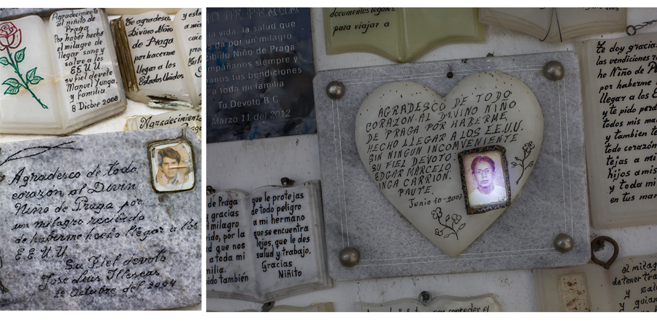 El sur de Ecuador está lleno de santos y vírgenes a los que se les atribuye el milagro de llegar a Estados Unidos. El Niño de Praga es el considerado más milagroso. Las cuatro paredes de su capilla están llenas de placas de agradecimiento que han poner los migrantes que han cruzado la frontera entre México y Estados Unidos. Algunas tienen fotos de los viajeros, fechas del “milagro”, detalles como que consiguieron llegar en quince días… En la parte de atrás de este peculiar sitio hay una vidente que, dicen, es capaz de saber si el migrante llegará o no a su destino.