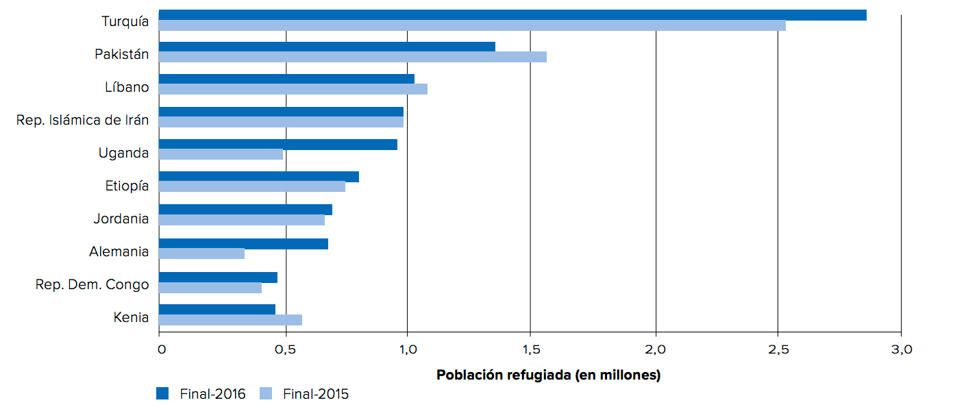 Cuando los europeos se preguntan qué países acogen más refugiados, su mente no viaja tan lejos, sino a Alemania, uno de los pocos países que durante estos años ha tenido sentido histórico. Hasta ahora, no aparecía en la lista de los diez que más acogen, pero al cierre de 2016 entró en la octava posición, con 669.500 refugiados, más del doble que el año anterior.