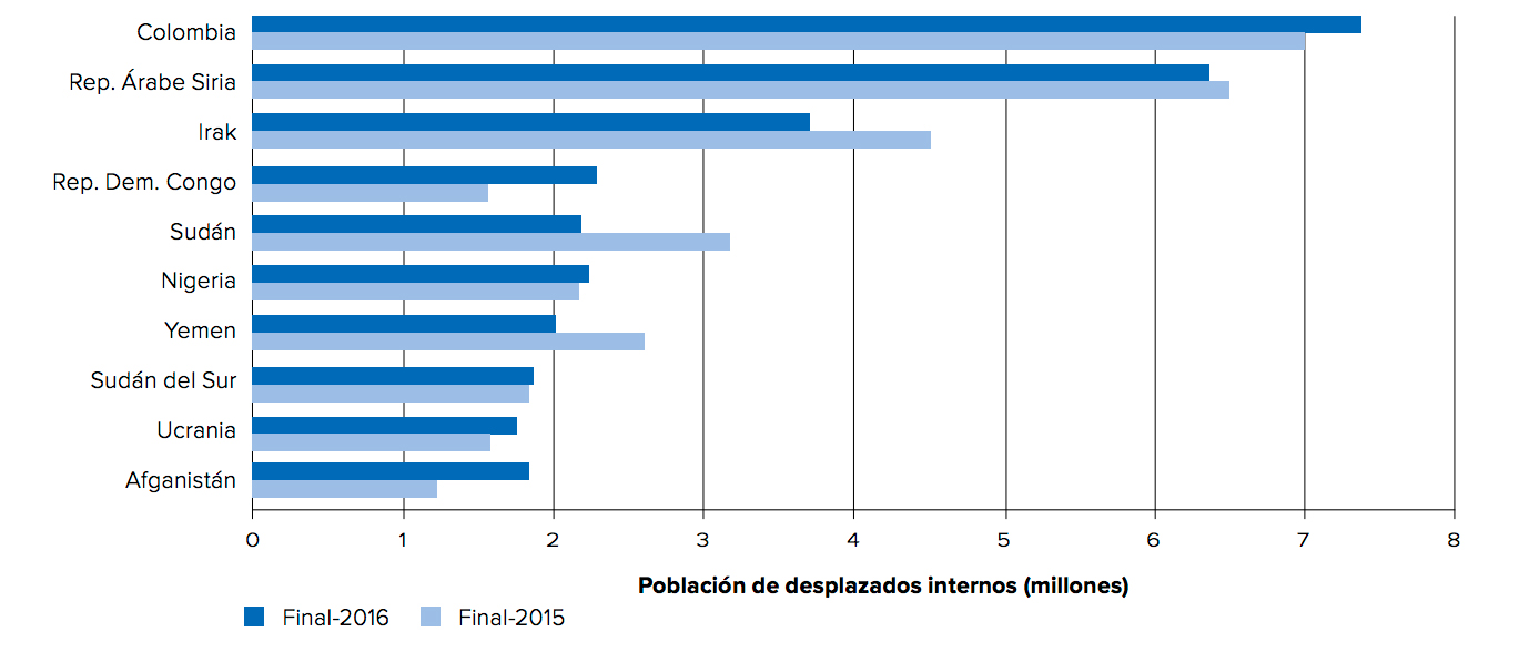 Colombia, Siria e Irak son los países con más población desplazada dentro de sus fronteras a causa de la violencia. Preocupa el repunte en países como República Democrática del Congo y Afganistán. Y la cifra ha bajado en países como Yemen, que había experimentado el mayor crecimiento de población desplazada en el mundo en el año anterior.