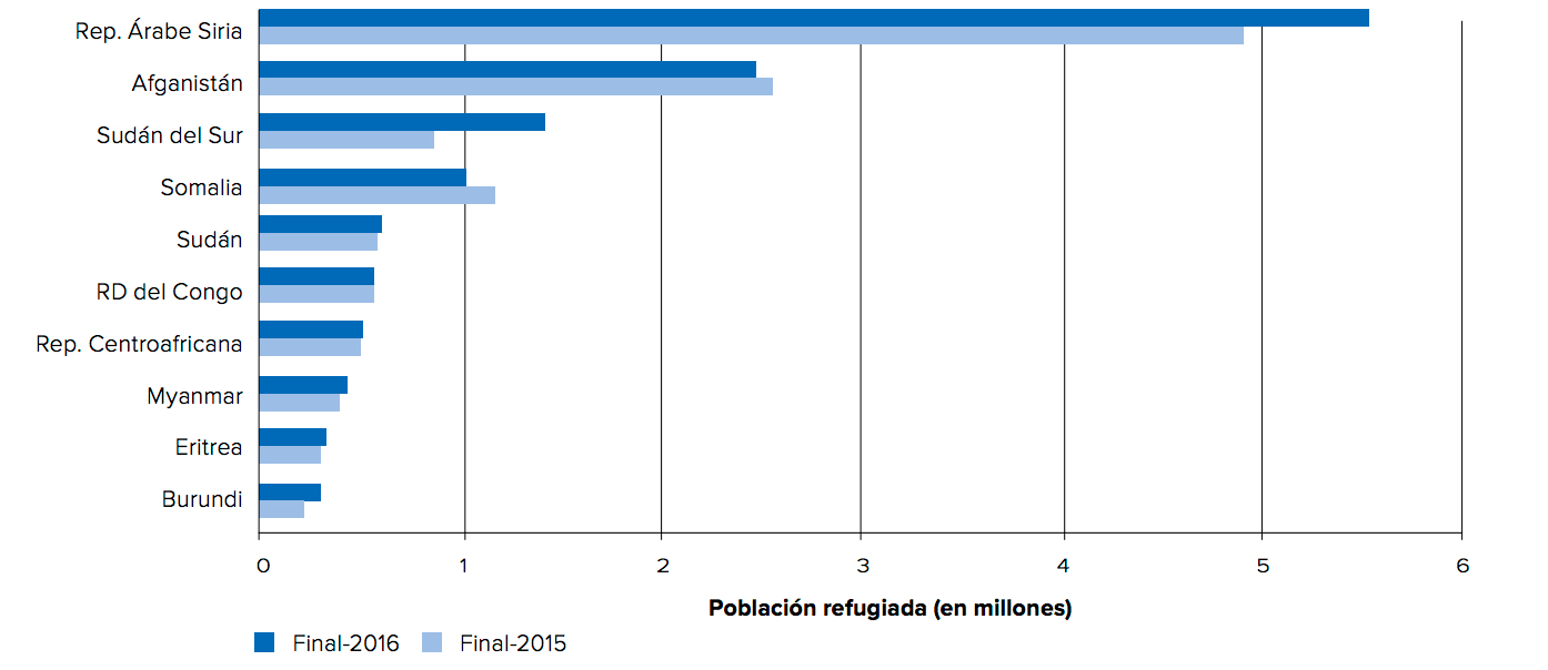 La población refugiada, la que está fuera de su país, ha crecido: de 21,3 a 22,5 millones, la mayor cifra jamás registrada por Acnur. El origen mayoritario de las personas en busca de refugio es Siria, Afganistán y Sudán del Sur. El dato demoledor es este: entre los tres colectivos, suman la mitad de la población refugiada del mundo.