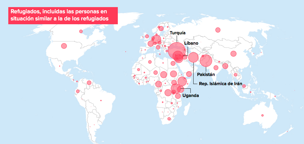 Turquía se mantiene como el país que más refugiados acoge (2,9 millones), seguido por Pakistán y Líbano. Datos que pueden llevar a engaño: si ordenamos los países por número de refugiados por cada mil habitantes, el top 5 estaría formado, en este orden, por Líbano, Jordania, Turquía, Chad y Suecia.