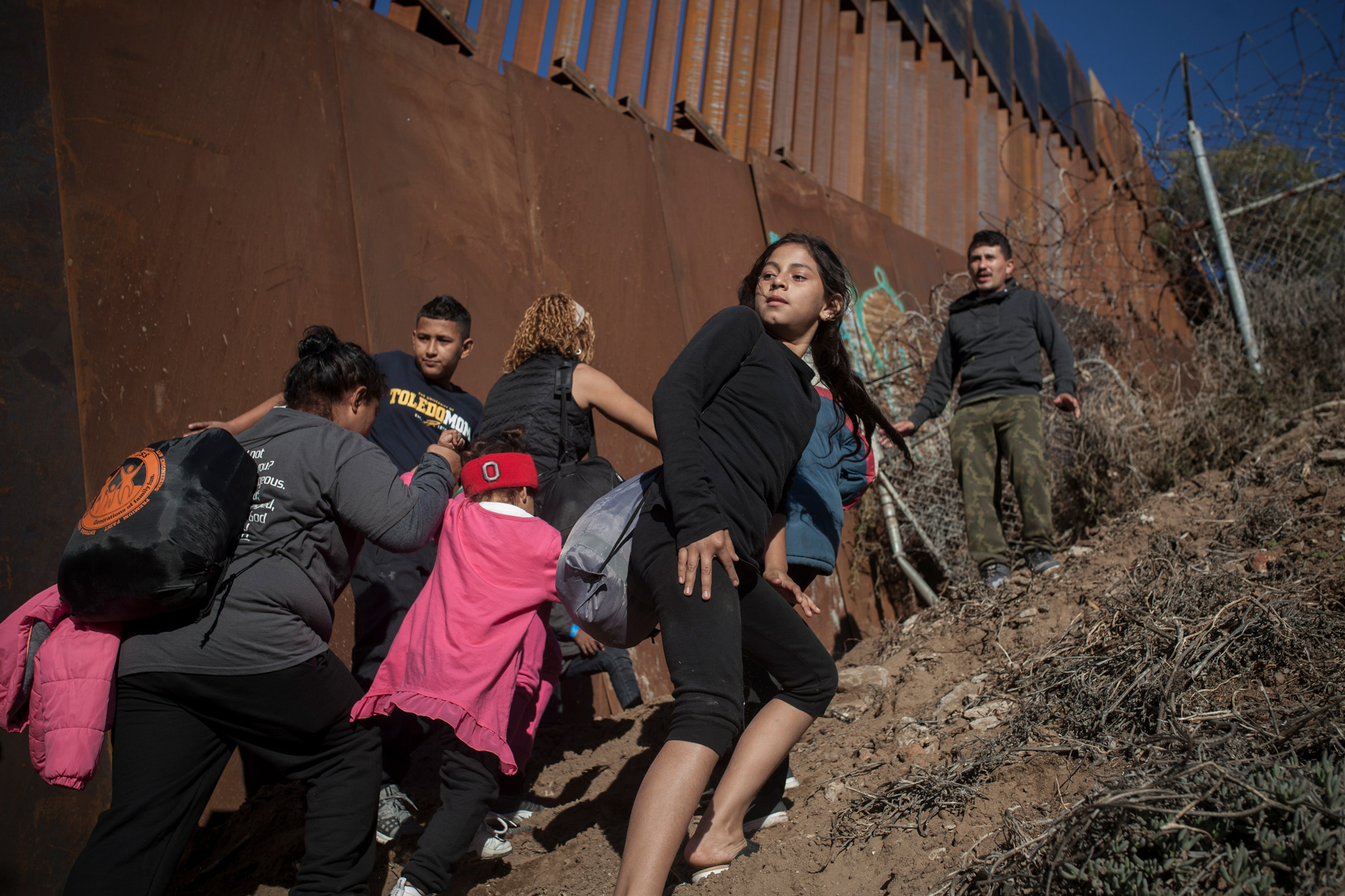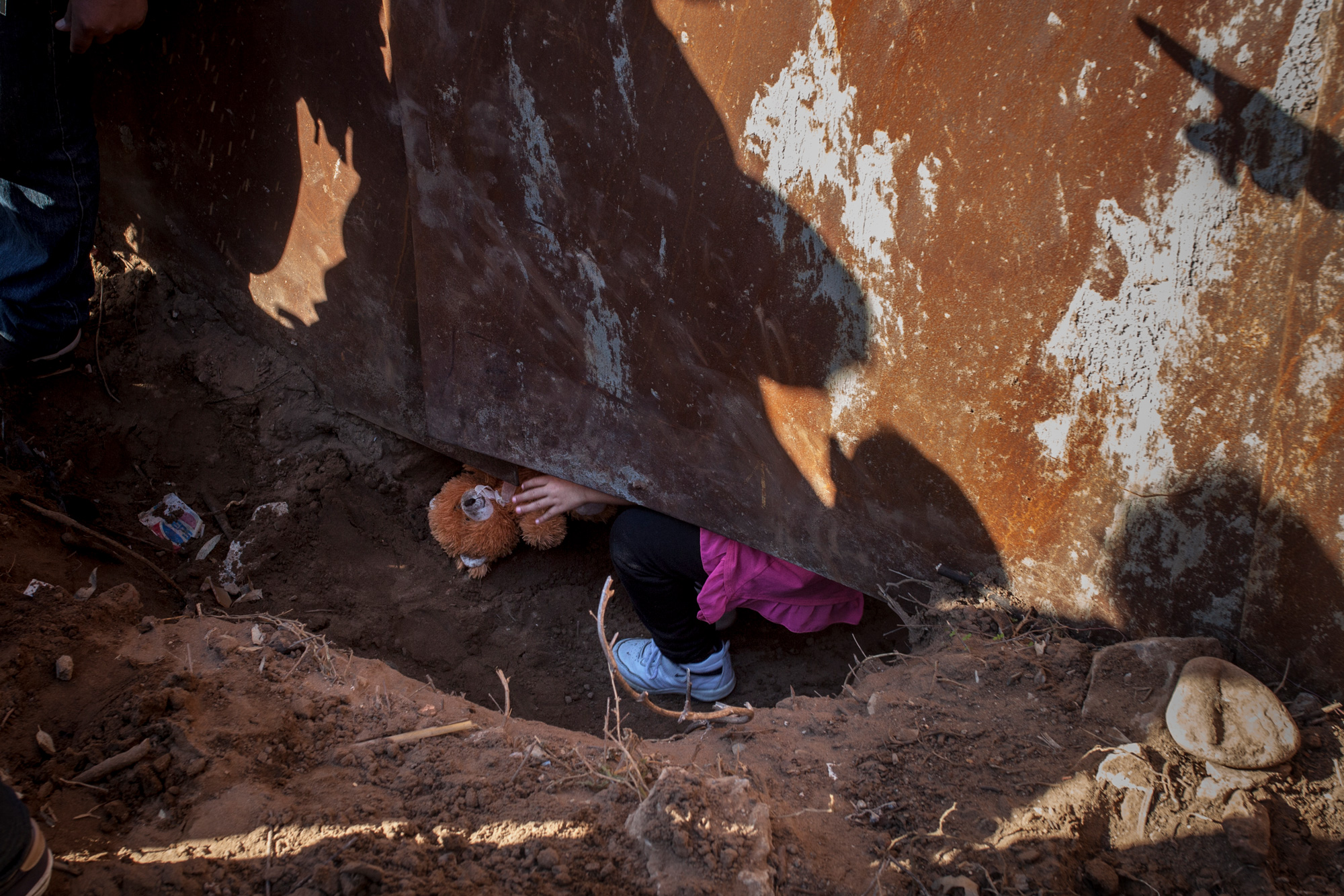Cada día se excavaban túneles y agujeros en el muro a la altura de Tijuana. Y cada día los funcionarios estadounidenses al otro lado los tapaban. Aquí hay una niña que está cruzando con su peluche. La pequeña iba con el grupo de la fotografía anterior. Cuando pasaron al otro lado, un agente de la guardia fronteriza de Estados Unidos les apuntó con un arma y los amenazó. Les dijo que estaban cometiendo un grave delito entrando en Estados Unidos y que tendrían que asumir las consecuencias legales. Los amedrentó. Y el grupo decidió volver atrás. Fue prácticamente una devolución en caliente: su amenaza hizo que se asustaran. La mayoría de migrantes, una vez llegan a Estados Unidos, normalmente se entregan de inmediato a las autoridades. Pero al cruzar y ver un hombre con un arma que los amenazaba, se echaron atrás.