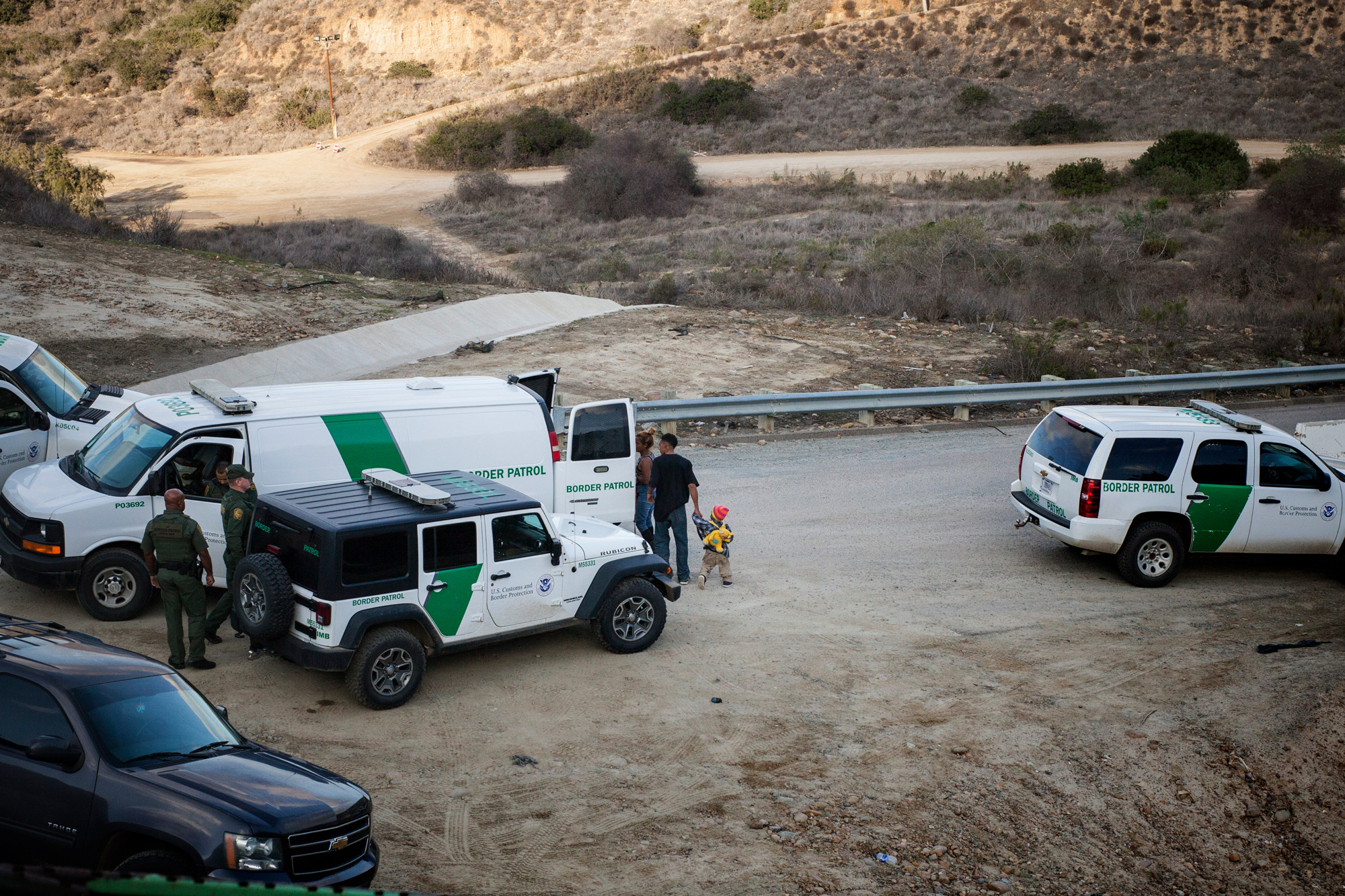 Esto es ya suelo estadounidense. Había un grupo de hondureños con un niño pequeño que había saltado el muro y que seguía avanzando. Lo que se ve al frente no es la frontera, sino una barrera adicional en suelo de Estados Unidos. A esa altura, aunque no se aprecie en la fotografía, hay una carretera que el grupo seguirá hasta encontrarse con la guardia fronteriza y entregarse.