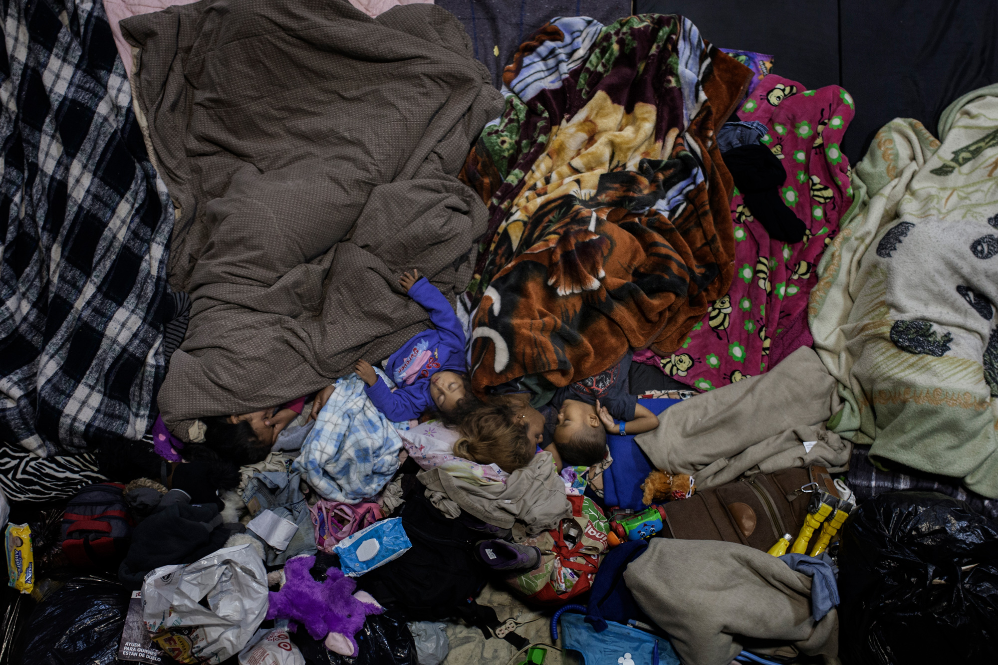 Dos mujeres y dos niños duermen entre mantas en la zona destinada para familias del albergue de El Barretal. Una de las características fundamentales de la caravana ha sido la gran cantidad de familias, mujeres y niños que había, muchos más de lo que habitualmente se ven en la ruta. Al ir todos juntos, han encontrado una forma de cruzar México de forma segura. Creo que ese es uno de los grandes éxitos de la caravana.
