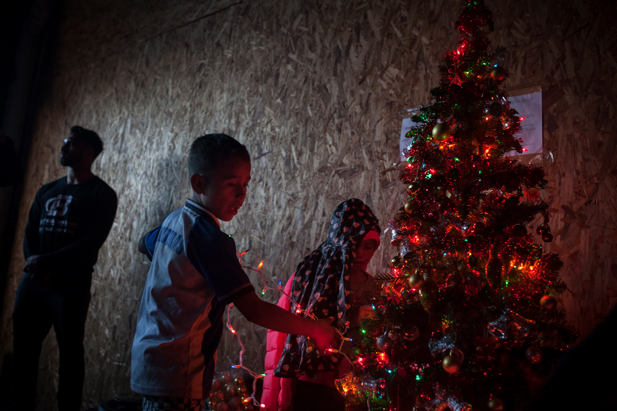 Un grupo de niños monta un árbol de Navidad en un almacén del barrio de la Zona Norte de Tijuana. Antes contaba que muchos migrantes se negaron a irse al otro albergue situado en las afueras, porque querían estar cerca del muro. Algunos resistieron en la calle. Como medida intermedia, las autoridades mexicanas les ofrecieron almacenes como este, porque así al menos podían sacarlos de las calles.