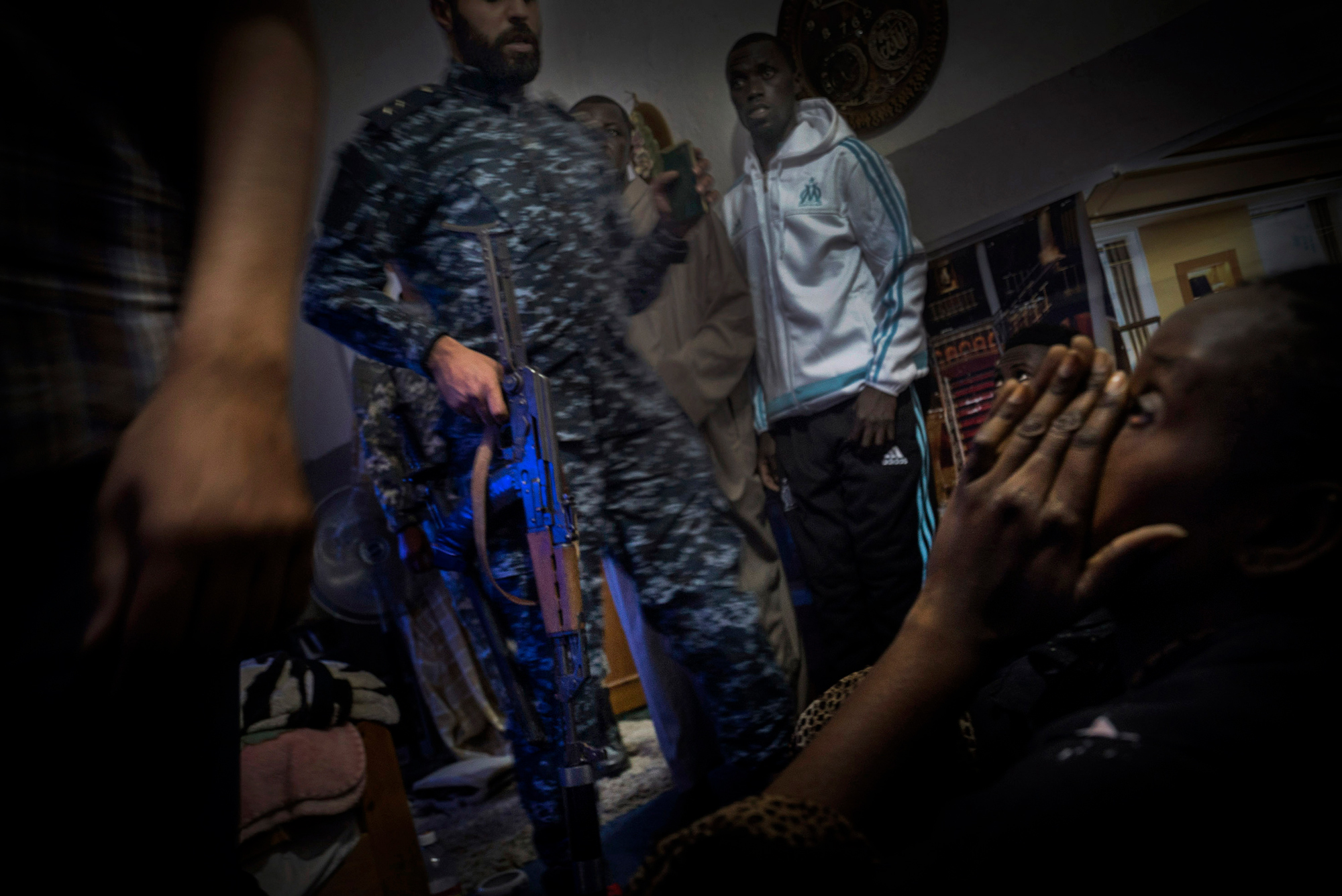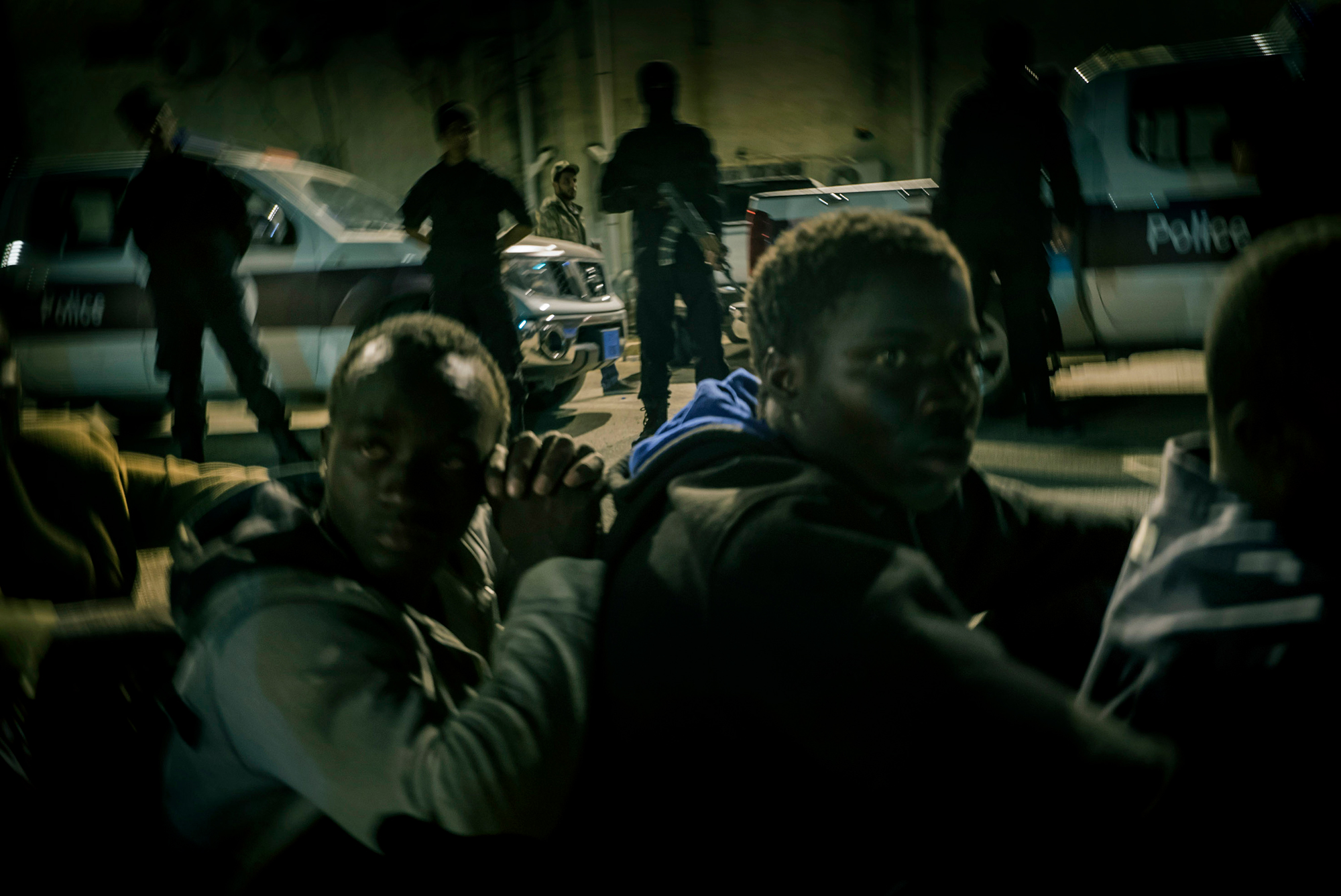 Nada más llegar al barrio de Hadba Gasi se inicia el asalto. Intentan no hacer ruido. Saben que, si son detectados, los traficantes huirán. Se distribuyen en grupos. Mientras unos fuerzan la puerta de entrada, otros trepan por los techos de uralita. Logran introducirse en el campamento, pero está completamente a oscuras. Sacan las linternas y los móviles para alumbrar la zona, y desde el patio que distribuye todas las viviendas empiezan el registro, ahora sí con energía. Van forzando una a una todas las puertas atrancadas con cerrojos, y dentro de los lúgubres habitáculos descubren a decenas de subsaharianos hacinados.