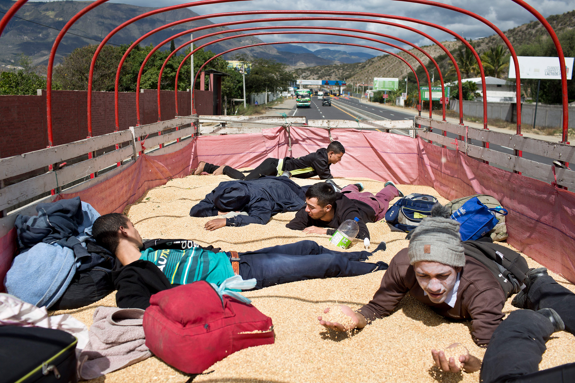 Hacen la ruta caminando pero también en lo que ellos llaman “mulas”: camiones que les recogen y transportan en parte del recorrido. Este era un camión de trigo. Me pareció interesante porque daba la sensación de que se lo tomaban como un juego: el conductor les dijo que fueran abajo para que no les viera la policía, y entonces se pusieron a jugar con el trigo. Parecía como si estuvieran dentro de un camión de pepitas de oro.