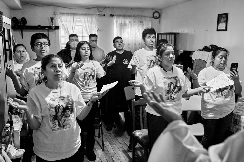 La sala se ha convertido en un altar íntimo con las fotos de Nemesio y de Gabriel; y las imágenes de la Virgen de Guadalupe y San Judas Tadeo. En la sala, nueve adultos, tres niños y una pantalla desde la que una abuelita en Atlixco, Puebla, México, ve la ceremonia.