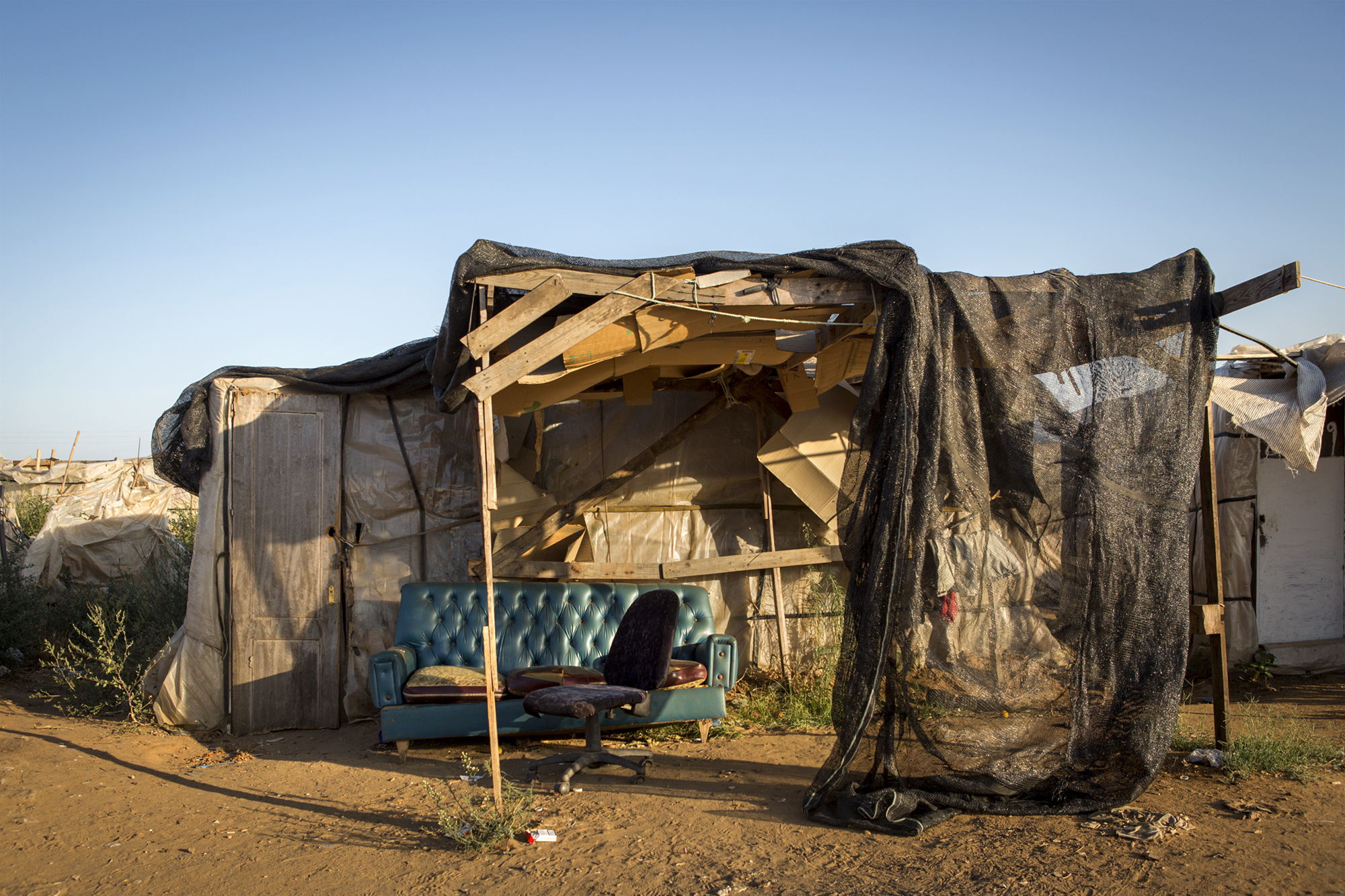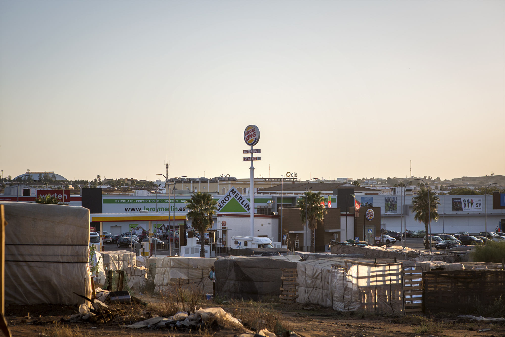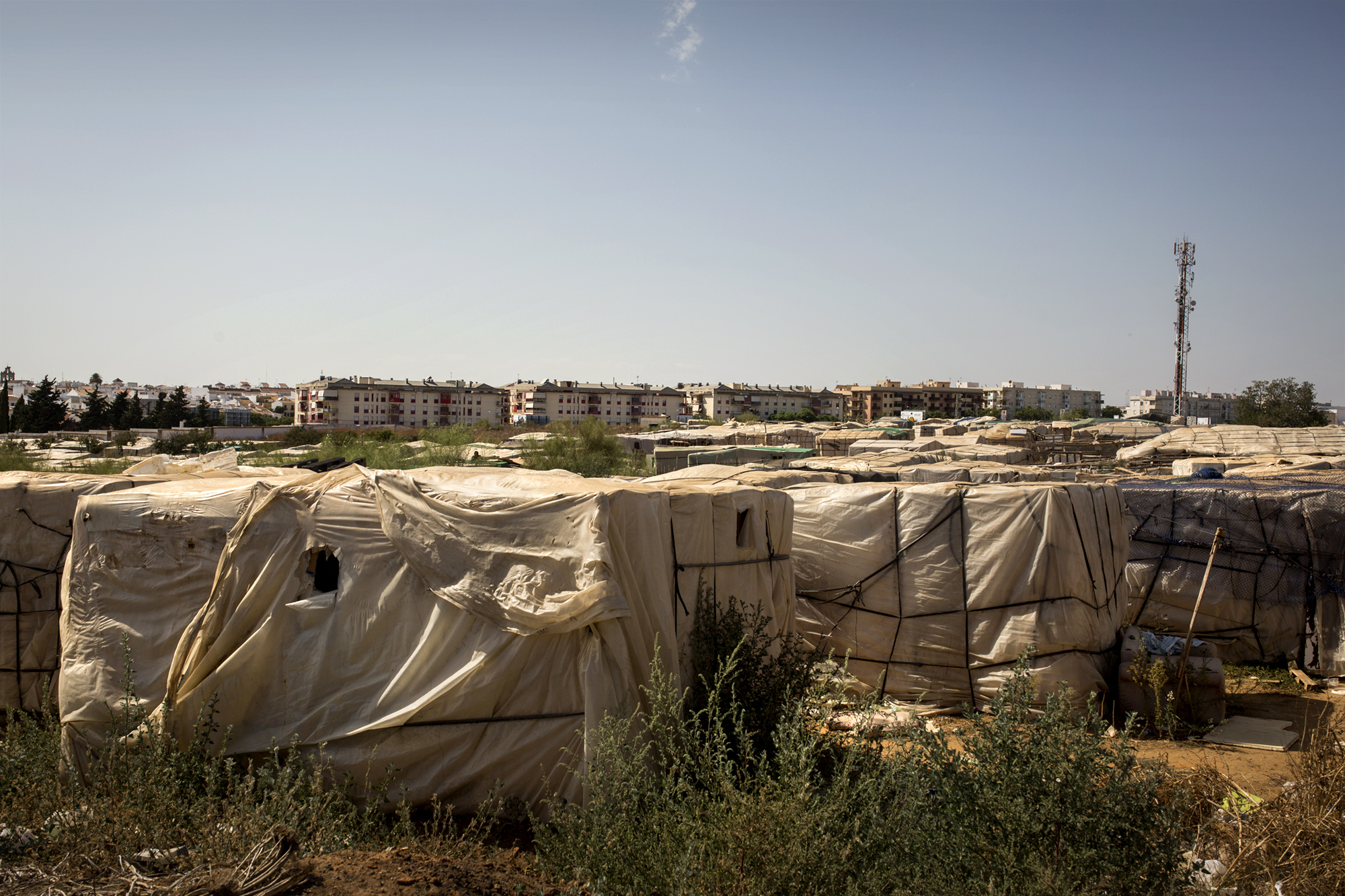Es verano y esto está casi vacío. Los trabajadores se han ido a otras cosechas, a la yincana del campo español, que cada año les lleva a visitar buena parte de la geografía agrícola peninsular. Algunas chabolas están vacías, pero en temporada aquí hay centenares de personas. En un tenderete entre dos chabolas hay varios amigos charlando, jugando a cartas. Hay sillas de plástico, un sofá con estampado de flores, un palé haciendo las veces de columna, música africana de fondo, una sombra, un gato.