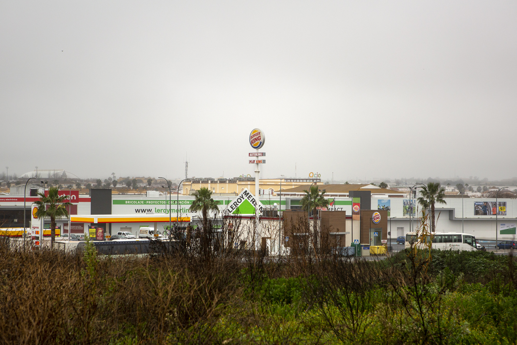 Un polígono industrial, el campo de fútbol del Club Deportivo San Roque de Lepe y una gran superficie comercial: Burger King, Leroy Merlin, una gasolinera, Worten, Espacio Casa (Bienvenidos). Enfrente del Parque Comercial Lepesur, en la ciudad onubense de Lepe, hay un cementerio y un solar convertido en asentamiento chabolista.