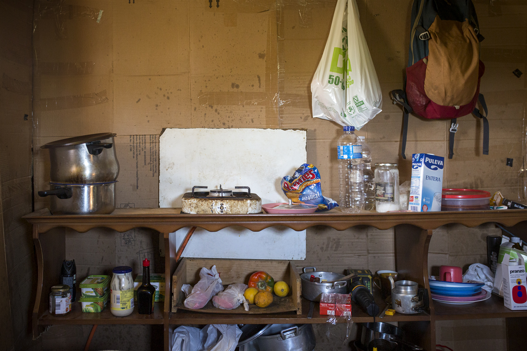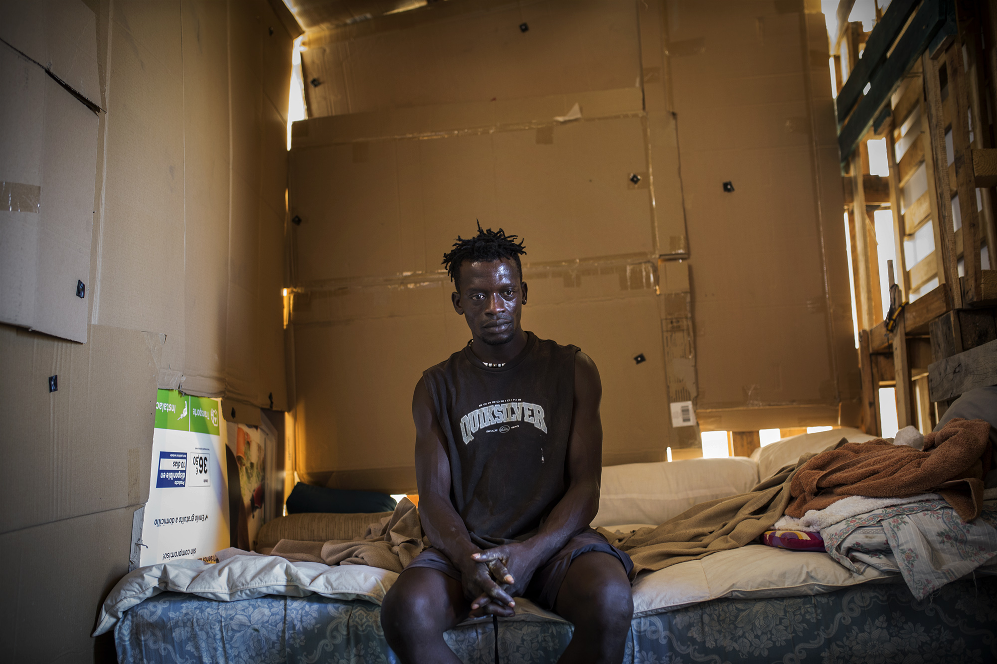 —Estoy cansado. En África la vida es mejor. Allí tengo mi propia casa, aquí no puedo explicarte cómo es… Muy malo. ¿Por qué tengo que vivir en una chabola? Muy mal España para mí, pero todo igual en Europa, en Italia hay chabolas, en Francia hay chabolas, en España hay chabolas. Solo en Alemania y Bélgica no hay chabolas. Voy a estar un tiempo y voy a regresar a casa. Algún día el fuego nos va a matar a todos. Yo estaba aquí las tres veces que mi chabola se quemó. No me gusta la chabola, no me gusta la chabola.