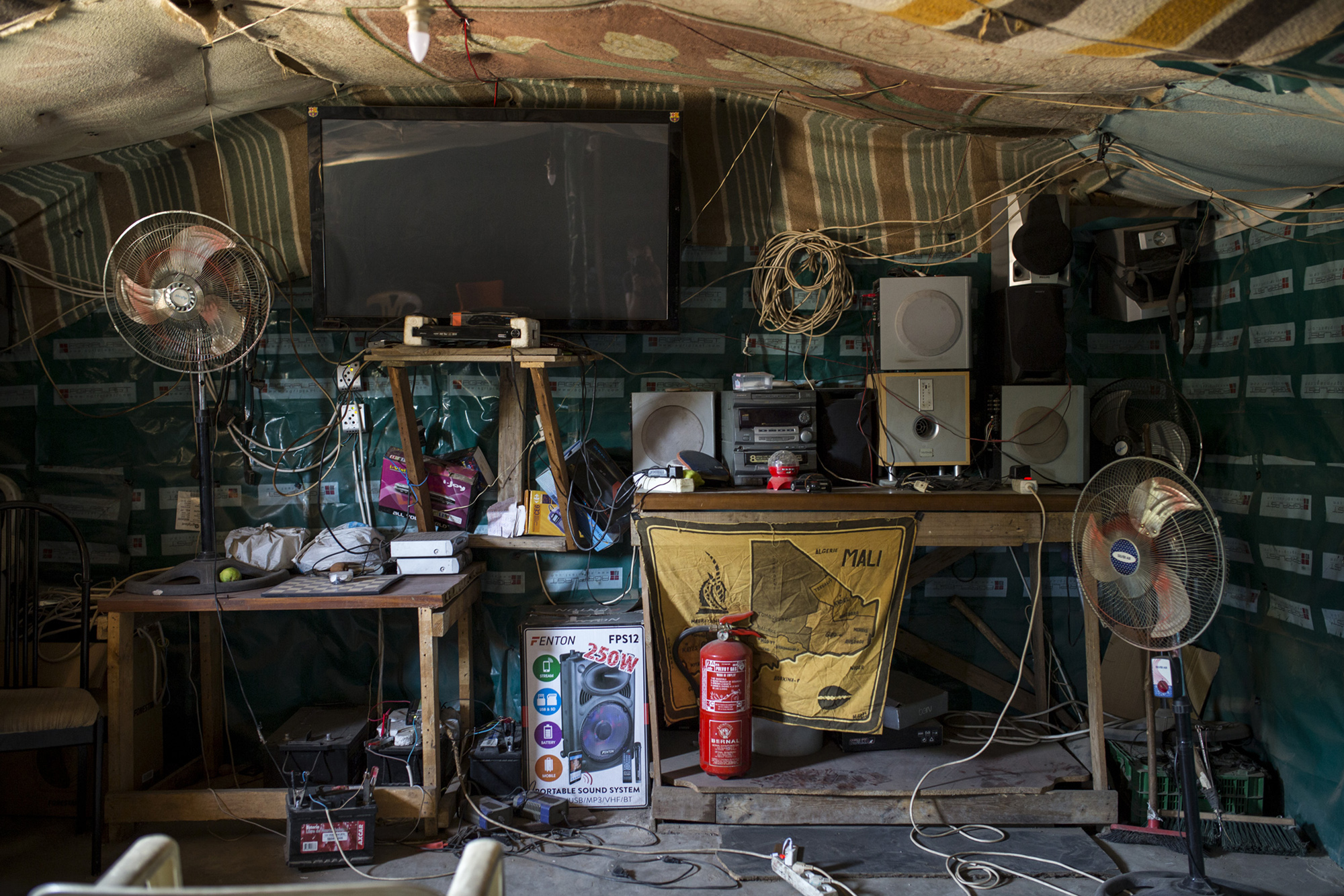 Visitamos el bar por dentro. Debajo del enorme televisor hay un reproductor de DVD y la consola del satélite. Beleti dice que aquí caben más de cien personas, aunque no me imagino cómo. Hay bancos de madera en los que caben seis personas, sillas de plástico de colores montadas en una pila en la esquina. Hay un tablero de damas con tapones de refresco como fichas, mantas aislando el techo, un póster de líderes religiosos de Mali, un mapa de Mali tapado por un extintor. Y un sistema artesanal dolby surround: ocho altavoces que rodean toda la sala.