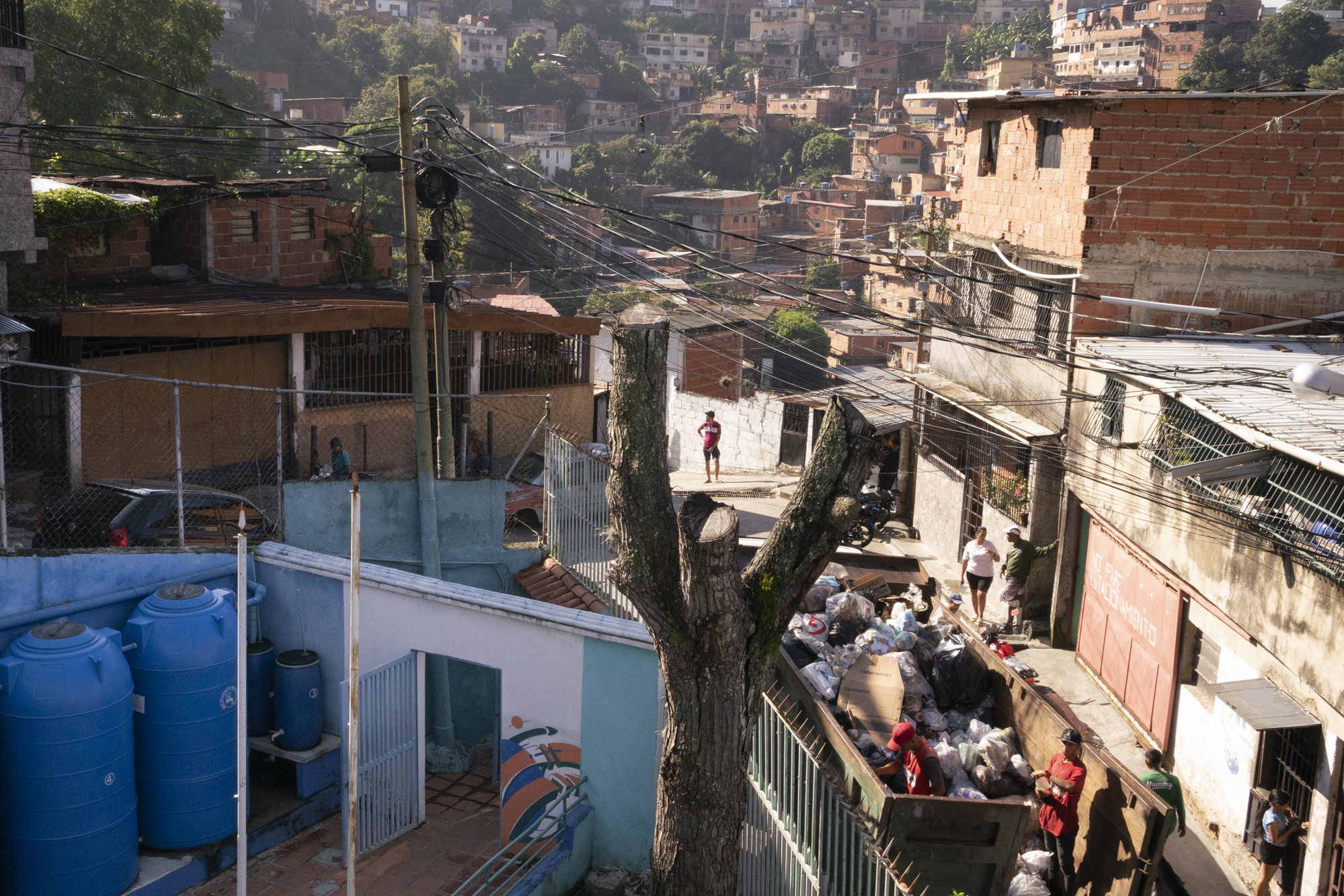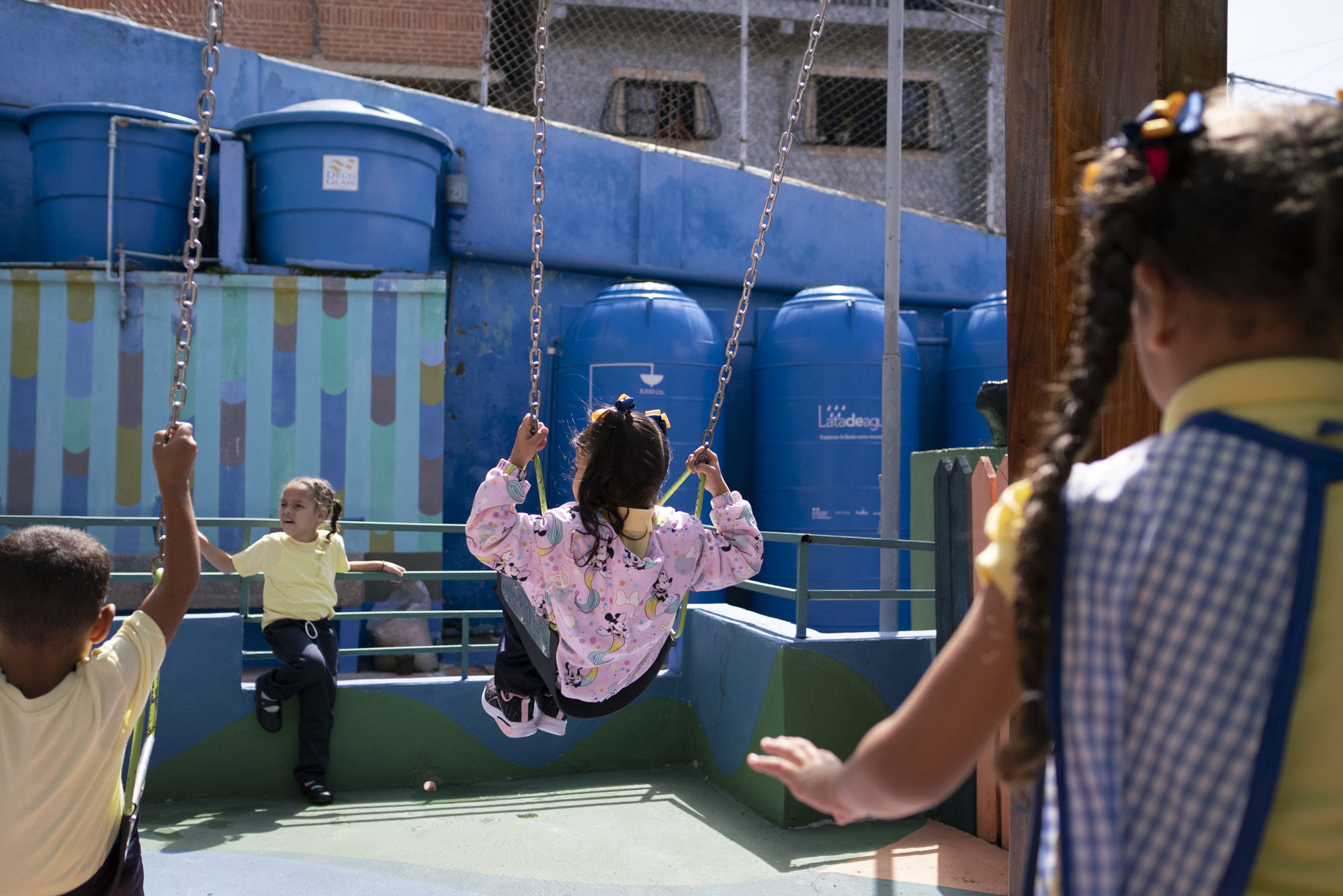 Los colegios beneficiados por Lata de Agua están ubicados en una esquina en descenso: la pendiente, paralela al edificio, es tan marcada que tanto las escuelas como el ambulatorio tiene su entrada independiente en cada piso, en un nivel distinto de la misma calle. Alrededor, los carros estacionan como pueden y dejan apenas un pequeñísimo canal de tránsito vehicular. La vía continúa y se divide en dos calles, una más regular y otra que baja, por la que se abre una pequeña ventana hacia la ciudad; por ella la gente sube lento, con esfuerzo. Hay un par de tiendas, una de alimentos y otra de apuestas; hay también numerosos perros y gatos callejeros acostumbrados al trato con humanos. En el suelo pavimentado y deteriorado hay trozos de una pared del preescolar cuya pintura se desmorona; afuera los padres esperan que sus niños se incorporen, mientras adentro se oye cómo entonan cancioncitas infantiles. Canta un gallo desde alguna casa, una mujer arranca maleza con sus manos, se oye a lo lejos el bullicio del camión de la basura que ahora busca los desechos frente al colegio y no a varias cuadras como antes, un muro tiene pintada la frase: “Tú y yo sabemos que se puede estar mejor”.