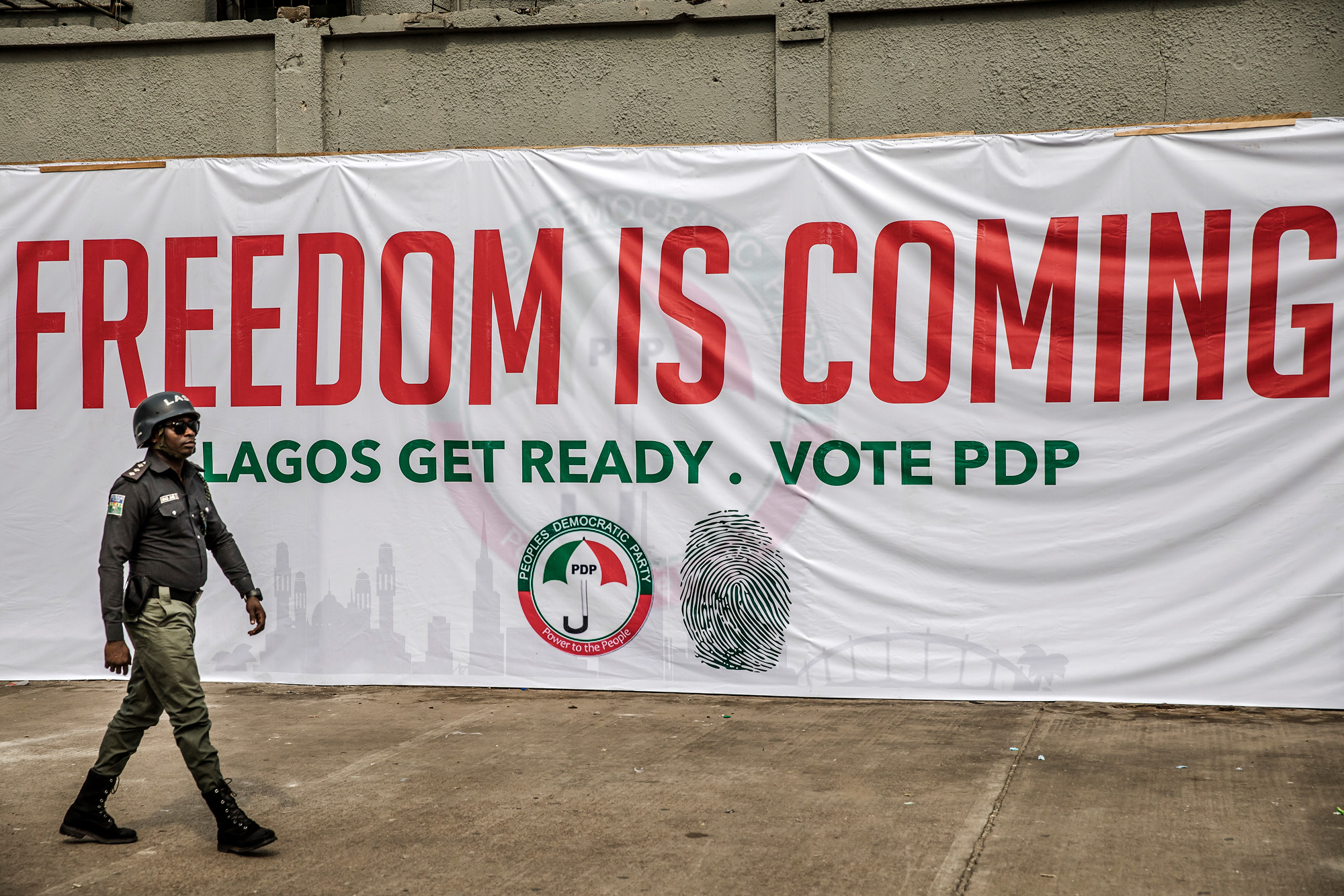 El opositor PDP de Atiku Abubakar celebró un gran mitin en Lagos unos días antes de la fecha inicialmente prevista para las elecciones, posteriormente aplazadas por la Comisión Electoral. Había una gran pancarta con la frase “La libertad se acerca” a la entrada del estadio donde Atiku se dirigió a sus seguidores. Un policía nigeriano aparece en la fotografía. La cantidad de agentes desplegada en las calles de Nigeria durante los días previos a las elecciones es sorprendente: no han faltado las voces críticas que hablan de un Estado policial.