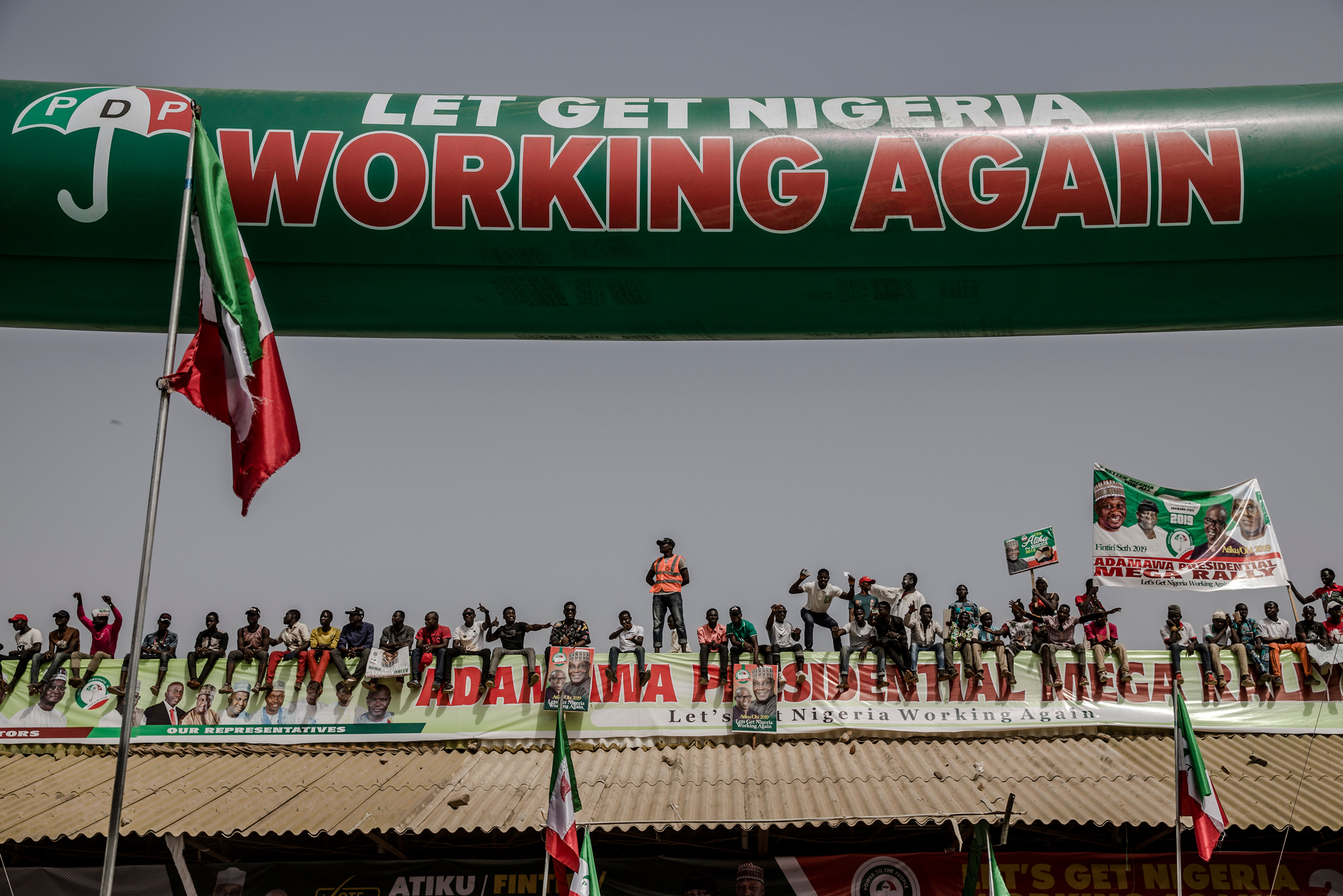 En la fotografía, decenas de personas subidas al tejado de un abarrotado estadio esperan la llegada de Atiku al mitin de cierre de campaña electoral en Jimeta Yola, en el estado de Adamawa. En la pancarta aparece el eslogan central de campaña del PDP, “Pongamos Nigeria a trabajar de nuevo”, que juega con el doble sentido sobre la necesidad de impulsar Nigeria como nación y la de crear nuevos puestos de trabajo en un país con cerca de un 30% de desempleo.