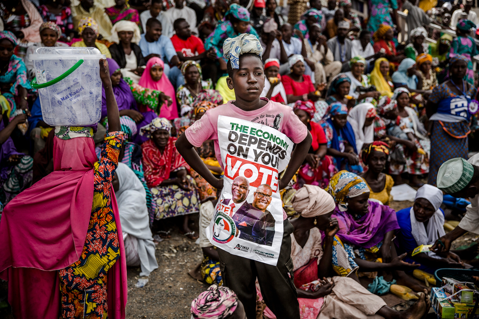 En la imagen, un joven asiste al acto de campaña electoral del PDP en Jimeta Yola con un cartel que dice: “La economía depende de tu voto”. La pujante corrupción y la desigualdad han alcanzado niveles alarmantes en Nigeria y han atacado el corazón de una economía hasta hace poco en recesión.