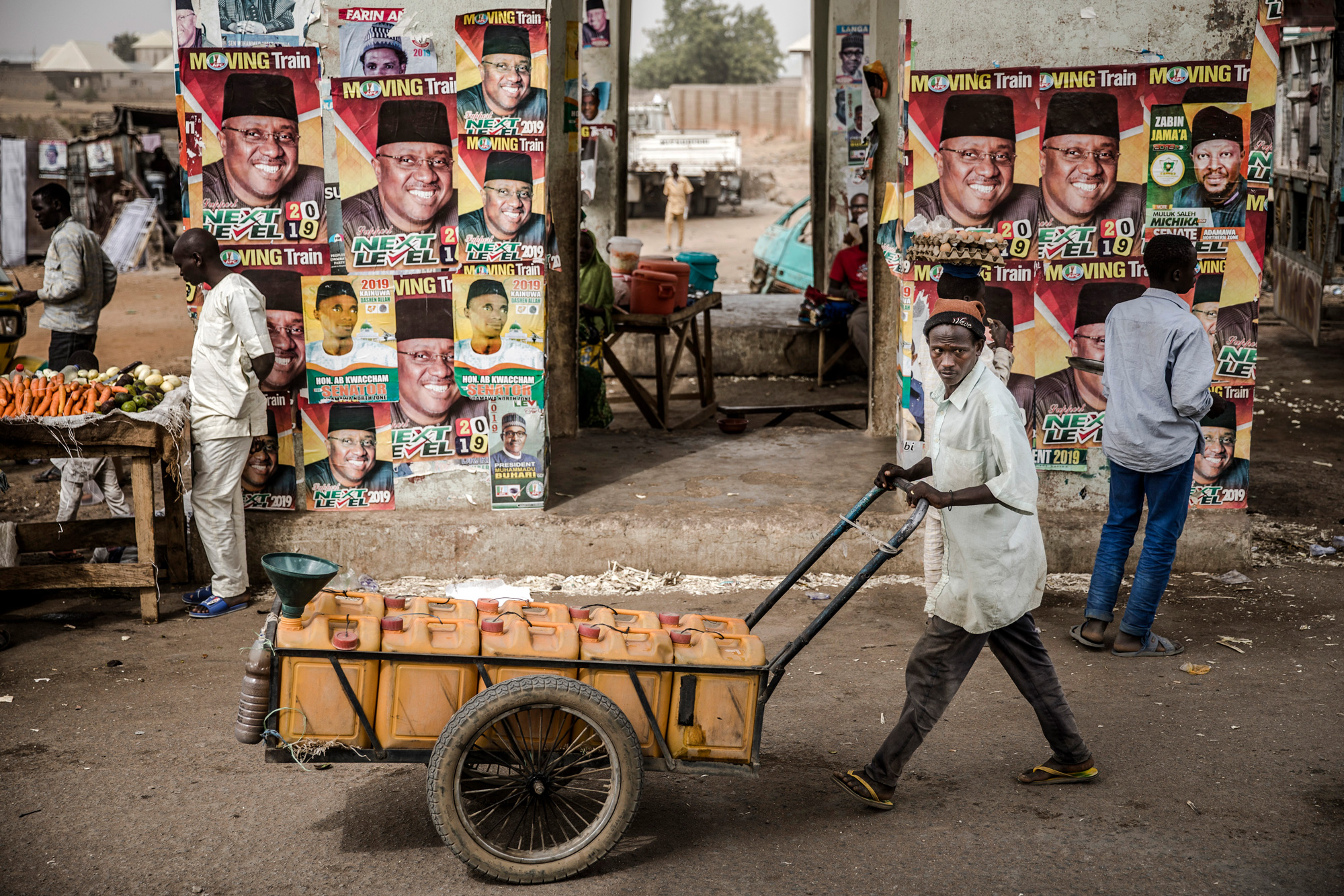 Mubi está repleta de historias de dolor relacionadas con el grupo yihadista, pero también está llena de resiliencia y solidaridad. Cristianos y musulmanes de la ciudad viven en armonía entre ellos, con Boko Haram como enemigo común. En la imagen, un hombre empuja un carro con garrafas frente a carteles electorales en apoyo a gobernadores del estado, cerca del mercado y la mezquita donde tuvo lugar el atentado de Boko Haram de 2017.