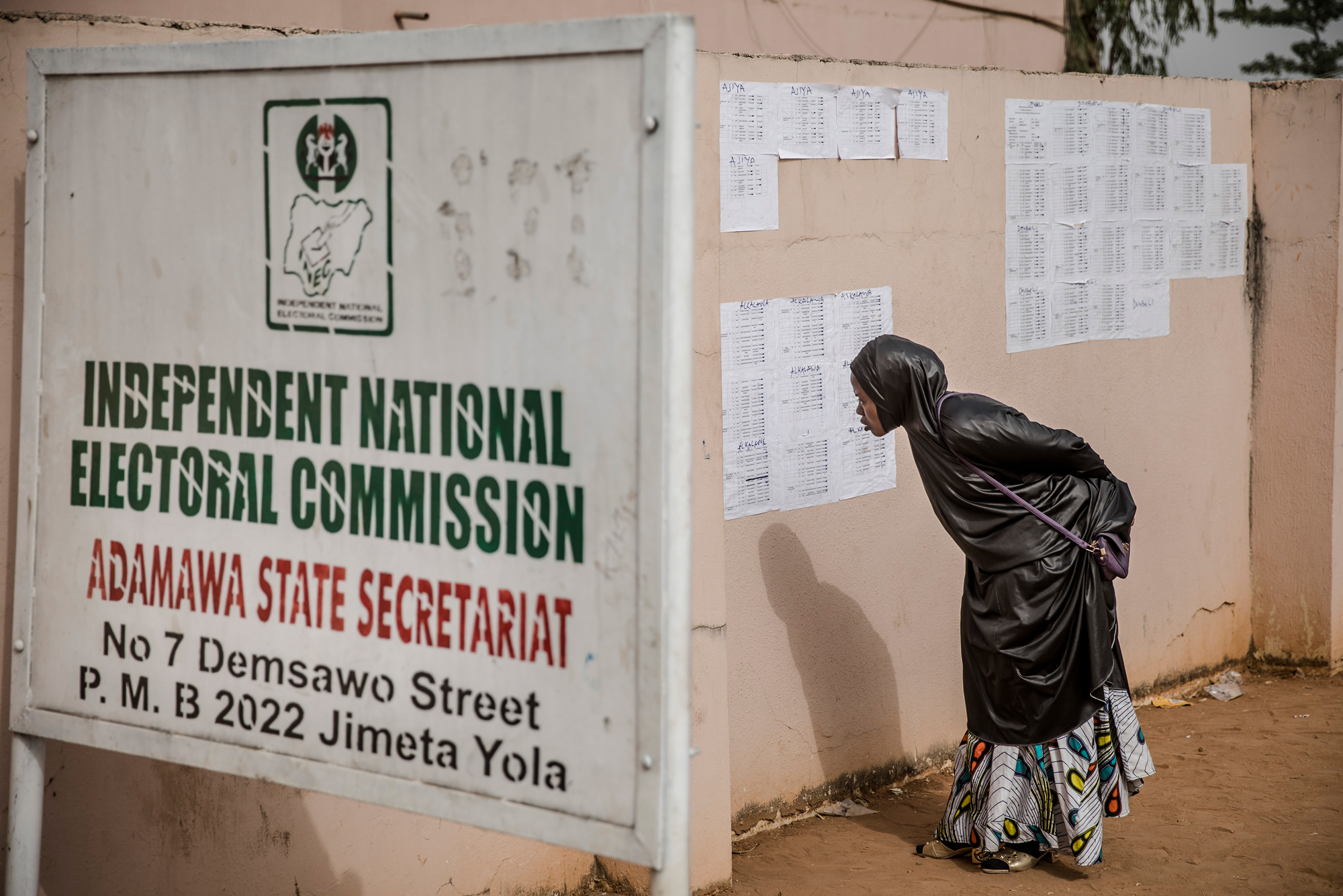 En la imagen, una mujer busca su nombre en las listas de votación del edificio de la Comisión Electoral de Jimeta Yola, donde decenas de personas buscaban comprender la situación tras intentar acceder a los colegios electorales para votar.