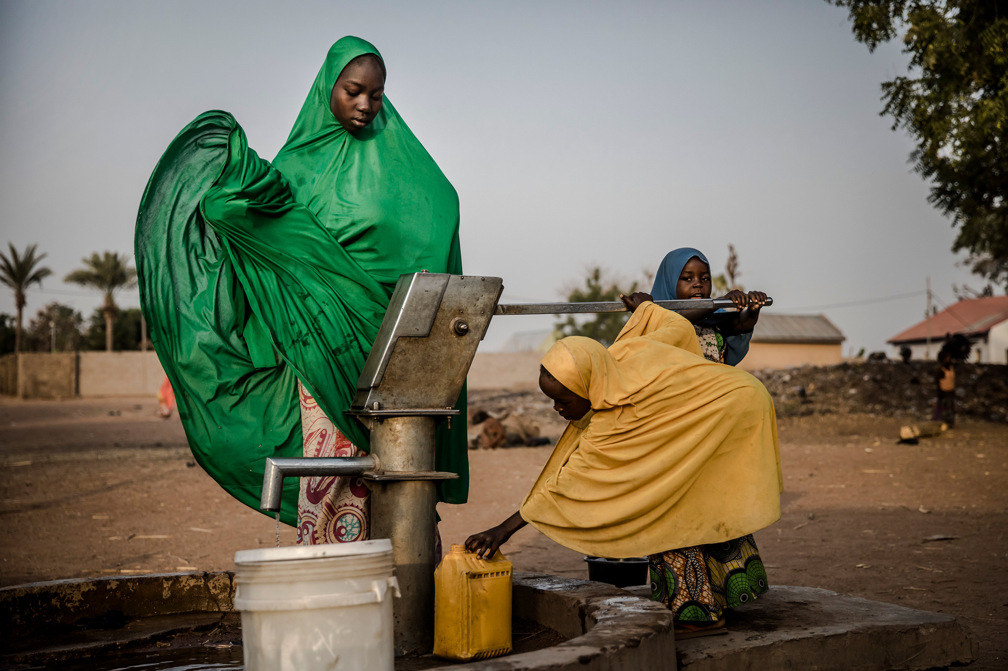 La vida cotidiana en Malkohi no se puede comprender sin el relevante papel de las mujeres, principales impulsoras de las dinámicas económicas y productivas dentro y fuera del campo.  En la imagen, una mujer y dos niñas desplazadas por Boko Haram y pertenecientes a la misma familia recogen agua de un pozo situado junto a sus viviendas en el campo de refugiados.
