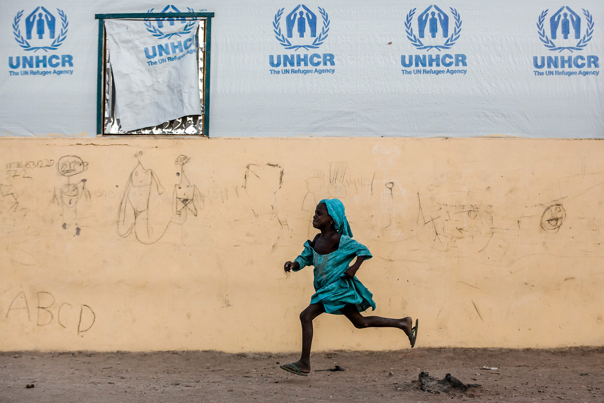 En la fotografía, una niña corre hacia la tienda en la que vive junto a su familia, tras jugar con otros pequeños frente a un colegio construido por la Agencia de la ONU para los Refugiados (Acnur) y oenegés en la zona sur del campo de refugiados de Malkohi.
