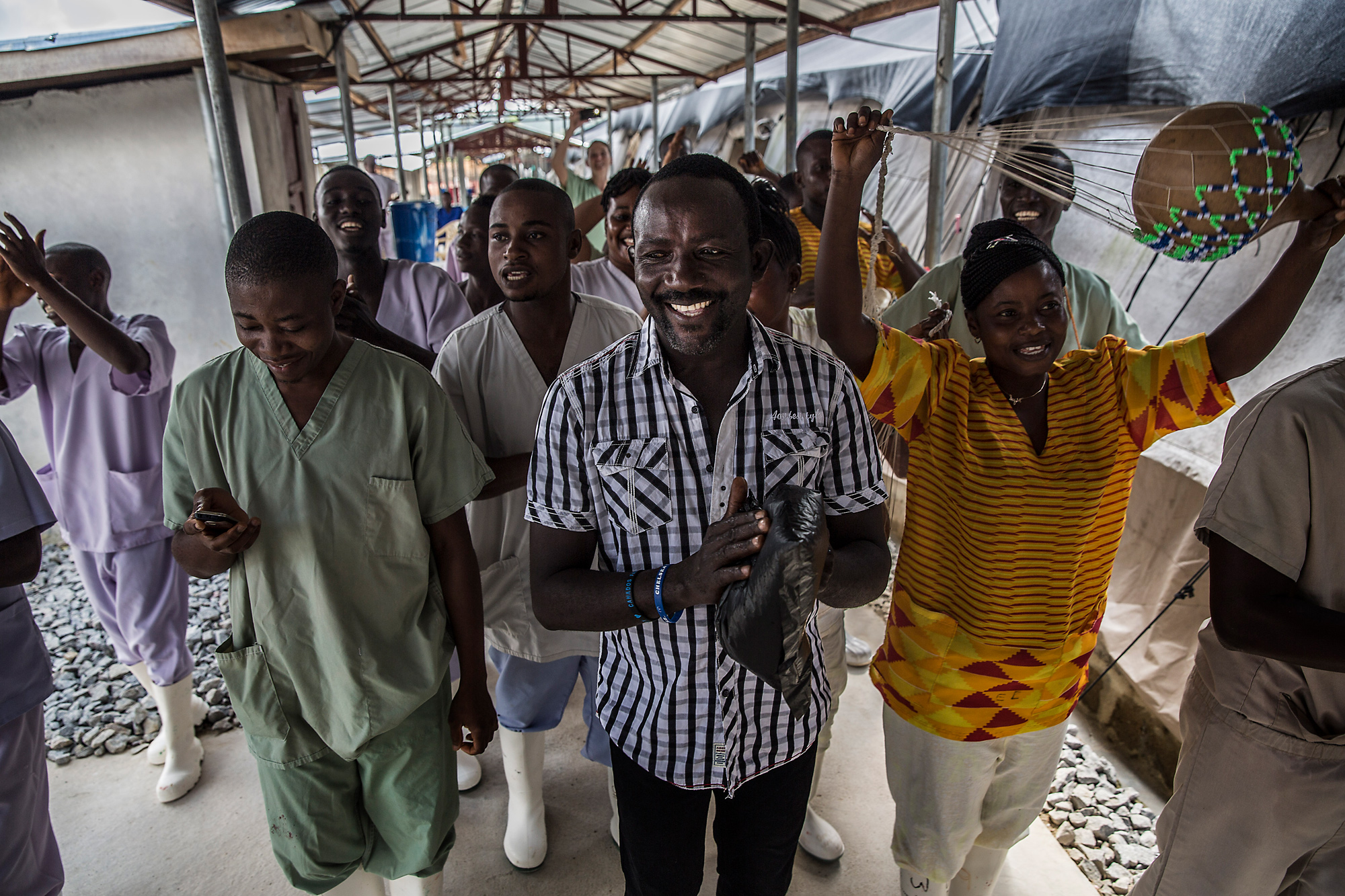 Los pacientes estaban débiles… y aburridos. Había a veces escenas desgarradoras, pero casi siempre había calma, una espera, un empujón para que pase el tiempo: cada minuto es un minuto ganado a la enfermedad. Un día, uno de los trabajadores liberianos se disfrazó de Michael Jackson para entretener a los pacientes. Al llegar a la malla de plástico que separaba la zona de alto riesgo de la de bajo riesgo, Michael Jackson, enfundado en un traje negro con camisa amarilla, efectuó sus característicos pasos deslizantes. Lo hizo al ritmo de una canción sobre el ébola, que decía cosas tan desasosegantes como “el ébola es un virus mortífero” o “el ébola está destruyendo nuestra nación”. No funcionará, pensaba. ¿Tú te crees que esta gente tiene ganas de bailar? Pero los pacientes se empezaron a acercar. Pronto eran una decena. Una mujer cabizbaja, sentada en una silla de plástico blanco, empezó a hacer palmas, casi sin fuerza. Apenas podían reírse. Querían moverse. Pero no podían.